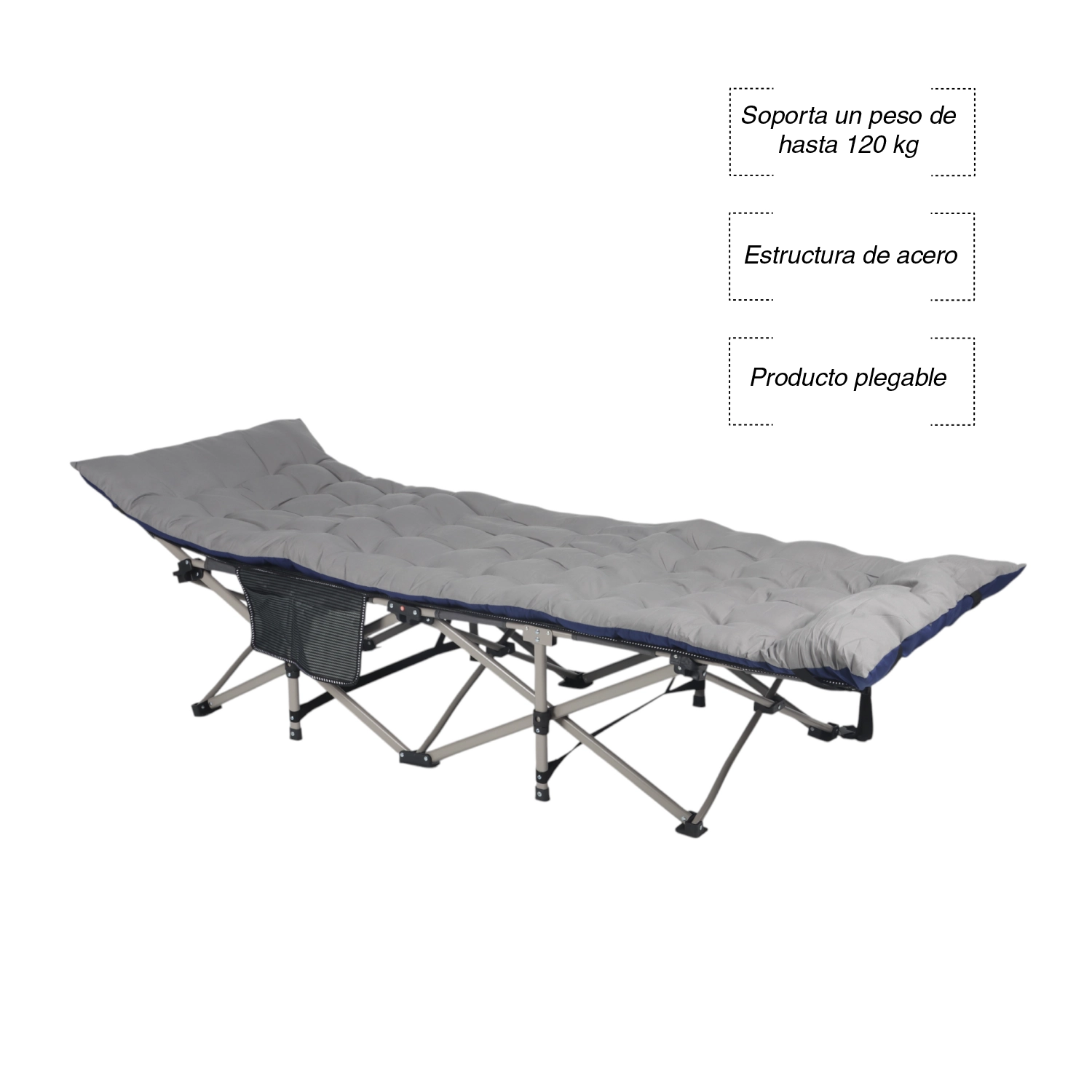 Con dimensiones de 190 cm de largo, 68 cm de ancho y 50 cm de alto, soporta hasta 120 kg, brindando un descanso seguro y estable. Su sistema plegable permite transportarla y guardarla sin complicaciones, ocupando muy poco espacio. Incluye bolsa de transporte y cojín, lo que la convierte en una alternativa completa y lista para usar.
