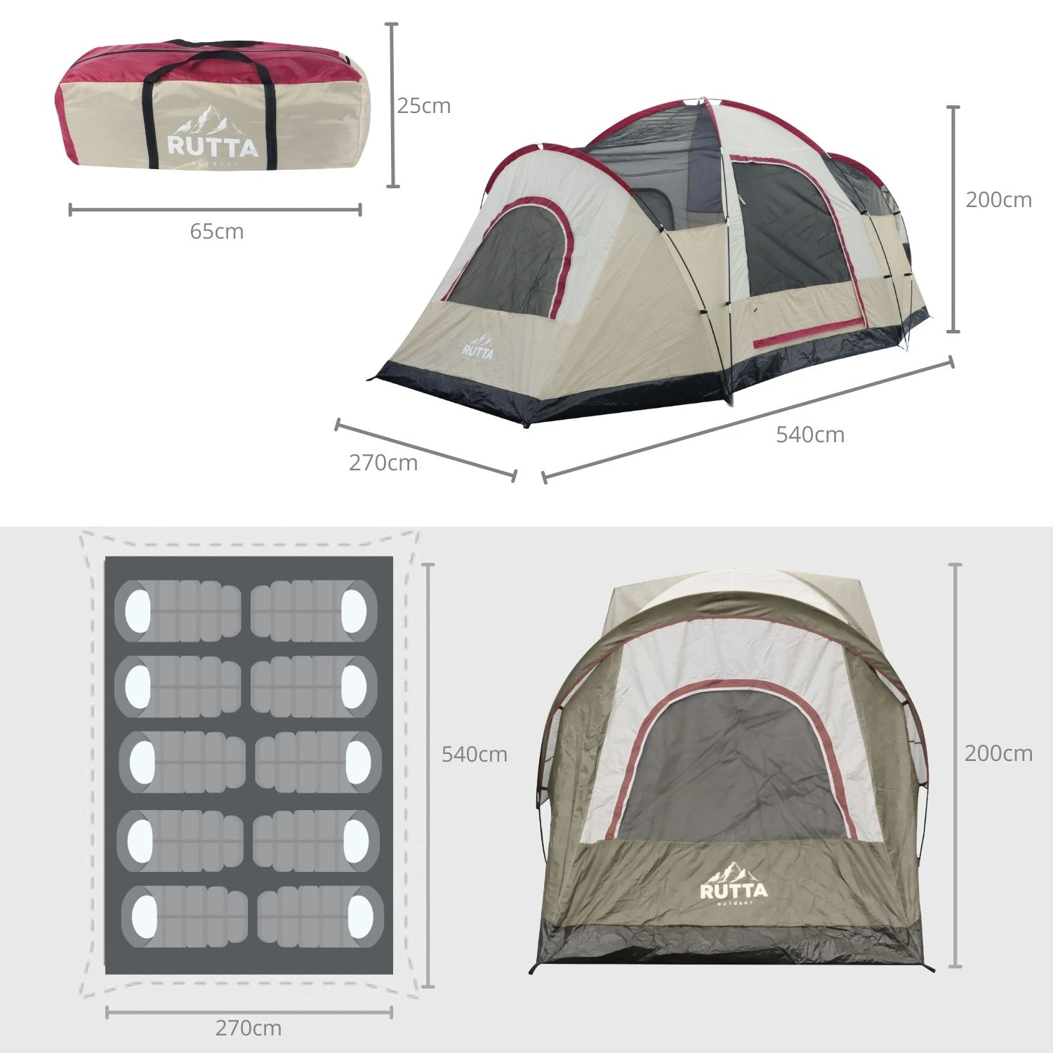 Con una estructura de PE y varillas de fibra de vidrio, esta carpa es resistente, duradera y fácil de montar. Su amplio interior de 200 cm de alto, 540 cm de largo y 270 cm de ancho permite alojar cómodamente hasta 10 personas. Además, incluye malla antimosquito que asegura ventilación y protección frente a insectos.