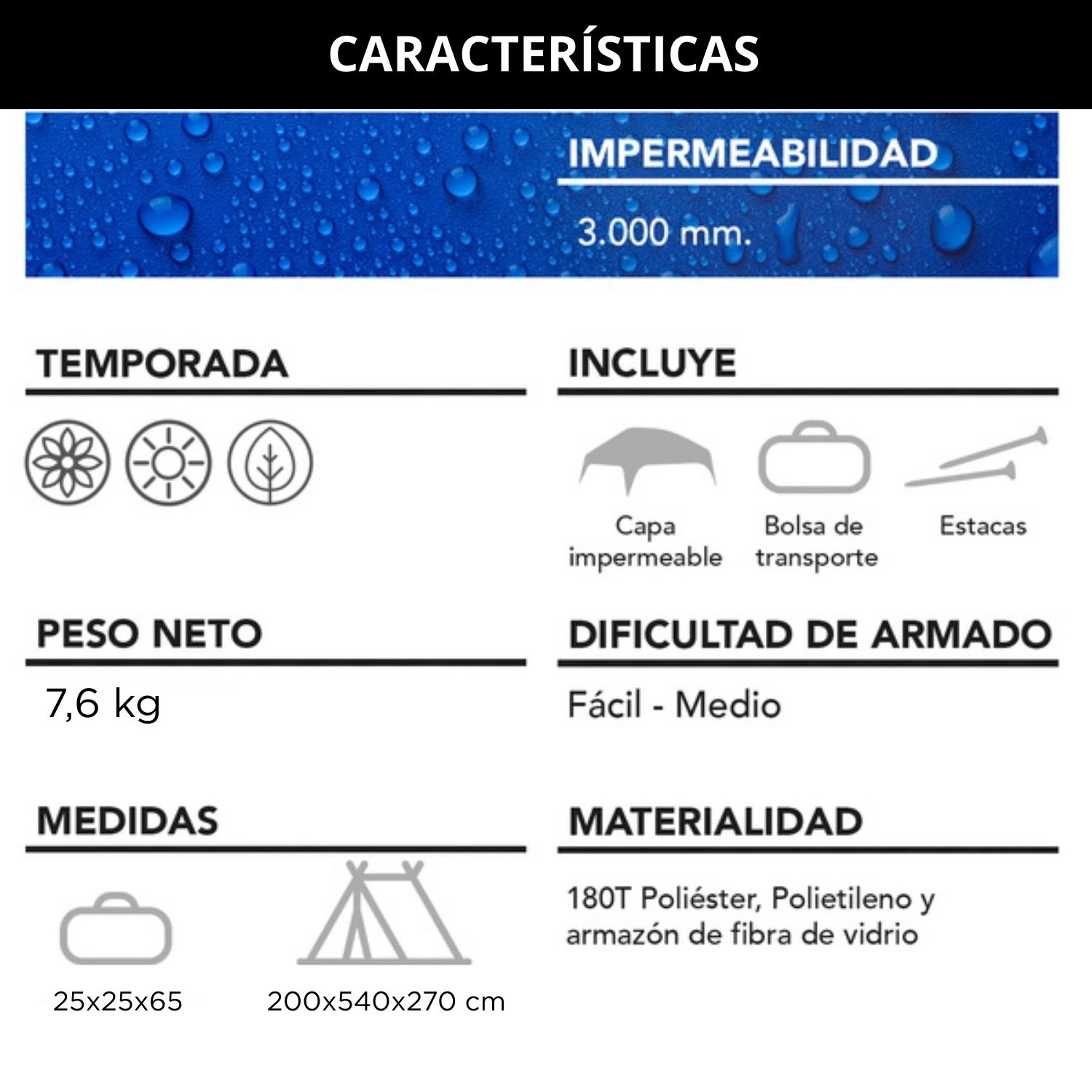 - Accesorios incluidos: Estacas y bolso de transporte.