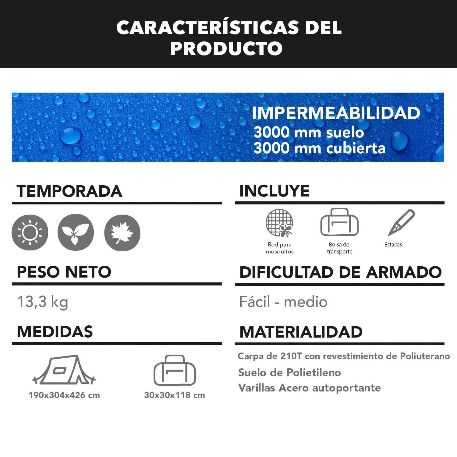 Material de la tienda: Polietileno 210T con revestimiento PU3000 mm