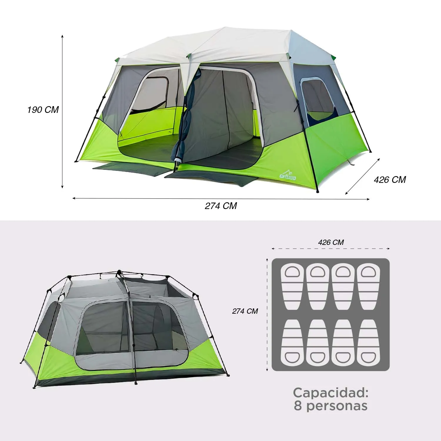 La carpa instantánea QuickCamp 8 personas está pensada para familias y grupos que buscan mucho espacio, armado rápido y excelente protección frente a la lluvia. Su estructura de acero autoportante permite montarla de forma sencilla y estable, mientras la tela polietileno 210T con revestimiento PU3000 mm entrega una impermeabilidad confiable en condiciones de humedad y lluvia intensa. Con 2 habitaciones separadas, ofrece mayor comodidad y orden al interior, ideal para organizar colchones, equipaje y zonas de descanso diferenciadas.
