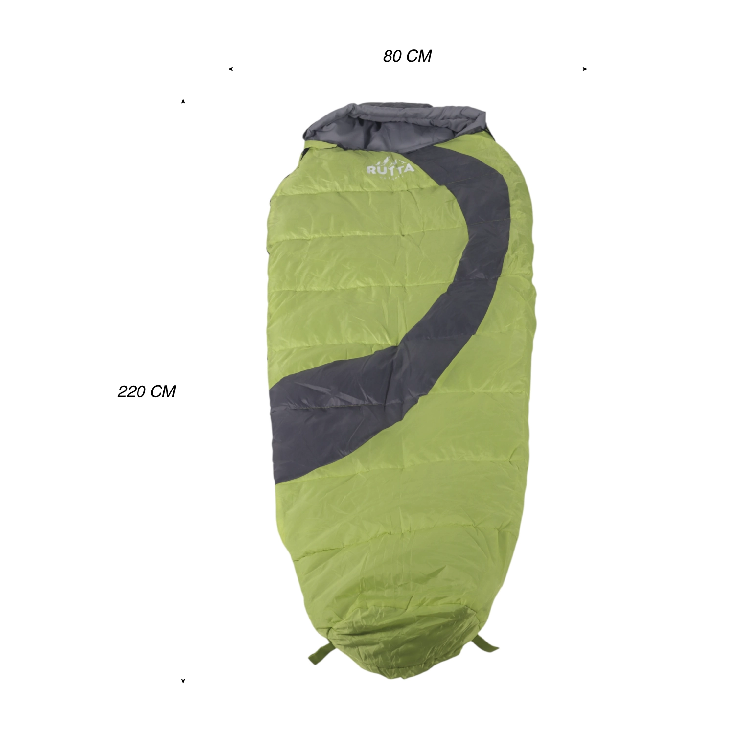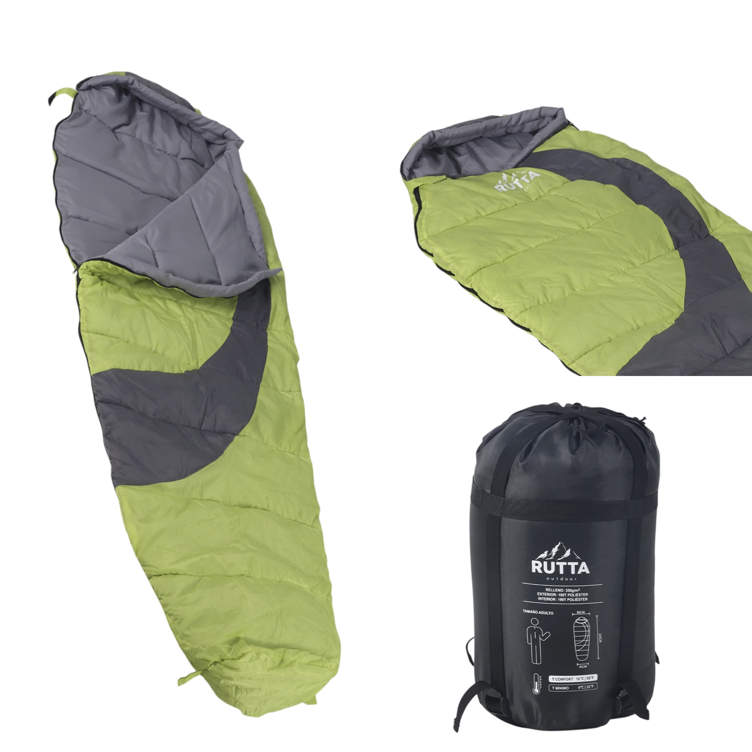El Saco de Dormir 350 gr Verde es la elección ideal para quienes buscan abrigo, comodidad y ligereza en sus aventuras al aire libre. Su diseño tipo momia se ajusta al cuerpo para mantener mejor el calor, siendo perfecto para verano, otoño o noches frescas en la montaña.