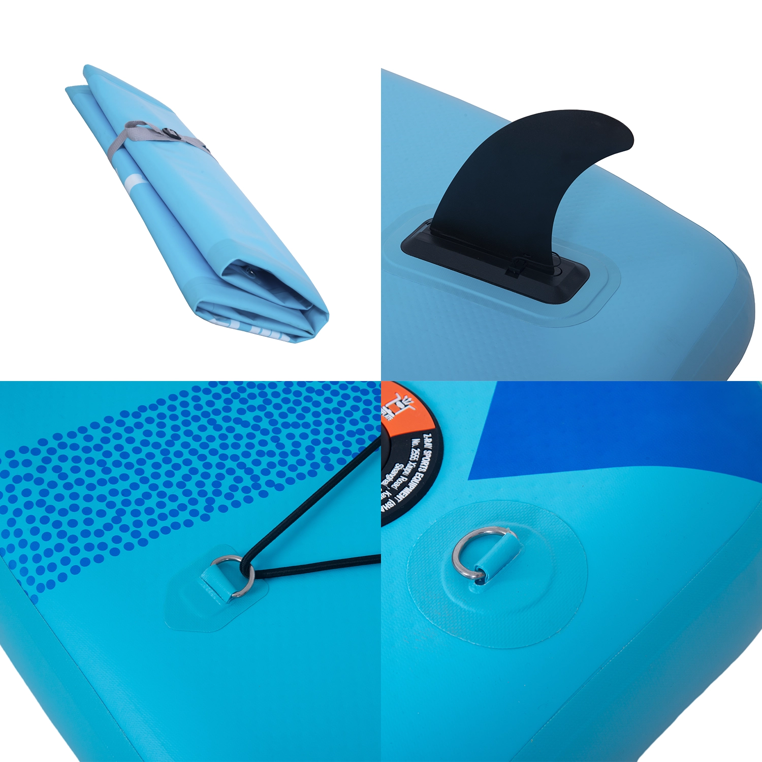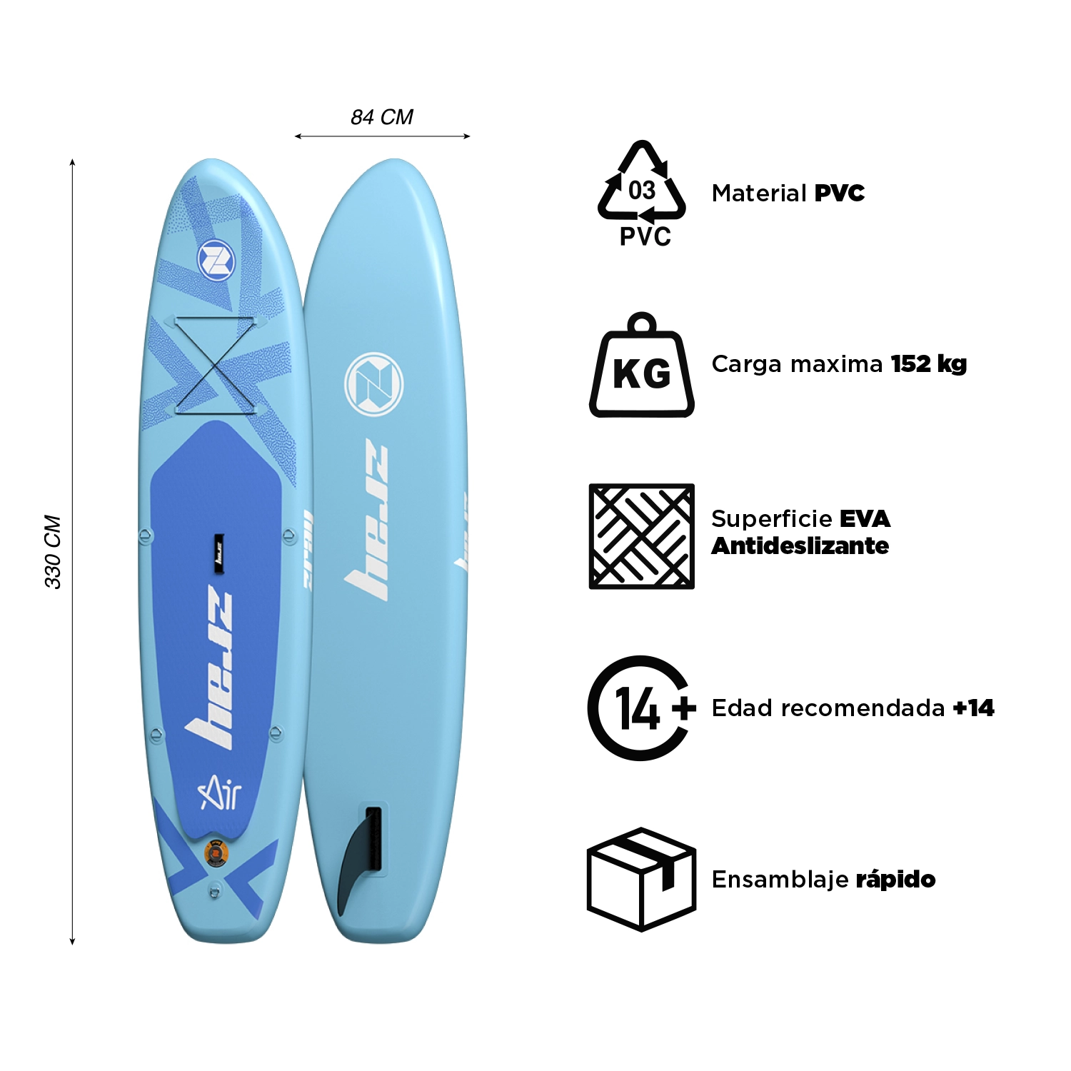 Con sus dimensiones de 330 cm de largo, 84 cm de ancho y 15 cm de alto, esta tabla es ideal para usuarios que buscan más espacio y estabilidad. Pesa 8,5 kg y soporta hasta 152 kg, lo que la hace adecuada tanto para uso recreativo como para entrenamientos más intensos. La aleta central entrega mejor control en la dirección y, al inflarse a 15 PSI, logra la rigidez de una tabla sólida, con la ventaja de ser ligera y fácil de transportar.